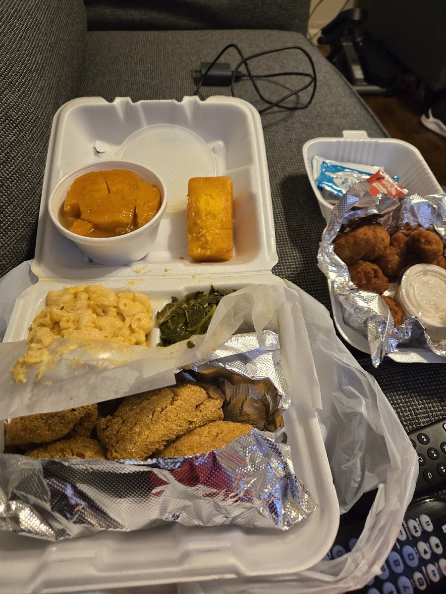 The menu leans into classic comfort dishes that many people crave when they think about real soul food. One of the standout plates during my visit was the Whiting 3 Pieces with 2 Sides. The fish came out perfectly golden and crisp, with a light crunch that gave way to flaky, tender whiting inside. Paired with two hearty sides, it felt like a complete, satisfying meal rather than just a quick bite. The portions were generous, and everything tasted freshly prepared.